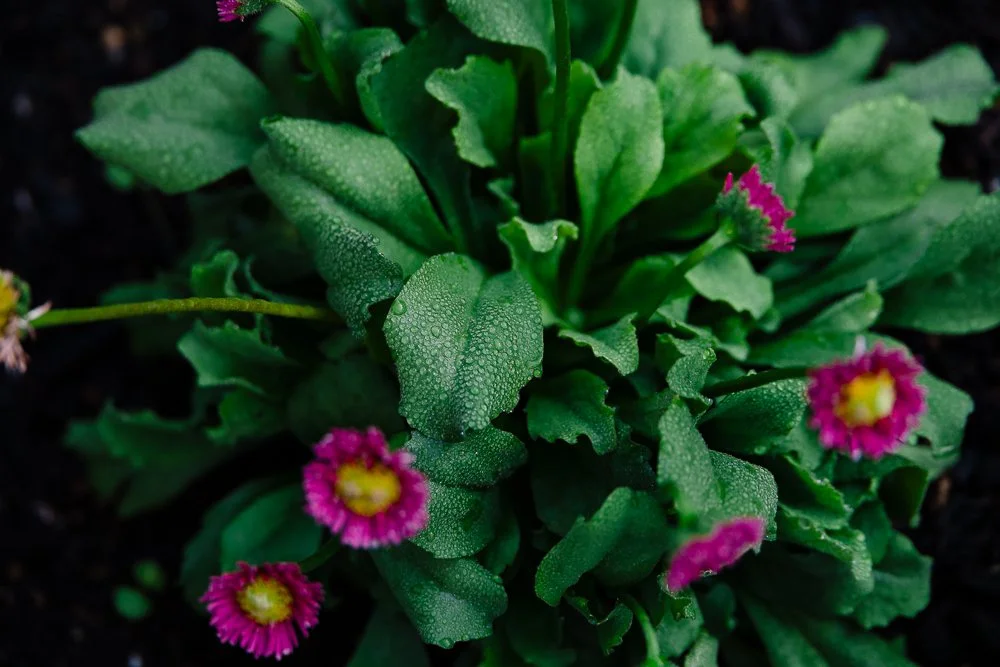Quickly I noticed the dew drops adorning the rest of the plants. I thought my flowers looked particularly adorable with both their pops of color and these temporary little decorations. I was quick to snap a photo of my Calendula and English Daisy.