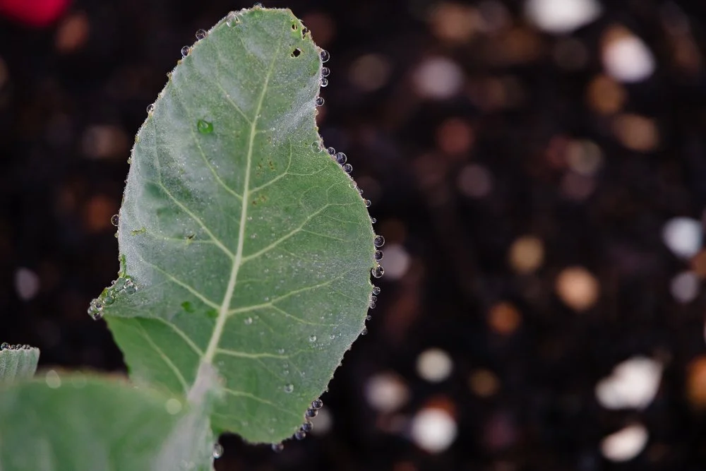 I figured it was the perfect morning to sit outside and write in my garden about my garden. I even have some photos share! The other day, I was so incredibly tickled by the sight of dew drops on cauliflower leaves that I grabbed my camera and captured the sight.